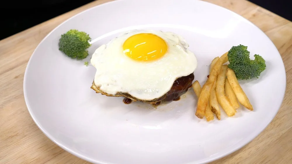 16. Pour your sauce on top of the hamburger steak. Then place the flower egg on top. Garnish the plate with french fries and broccoli