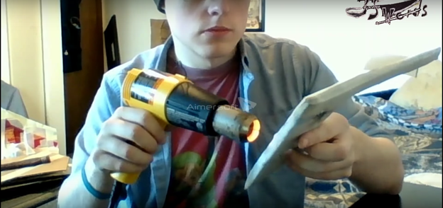 Using the heat gun, press one of the pieces of WonderFlex around the cardboard, pressing it down around the edges and molding it to the shape.